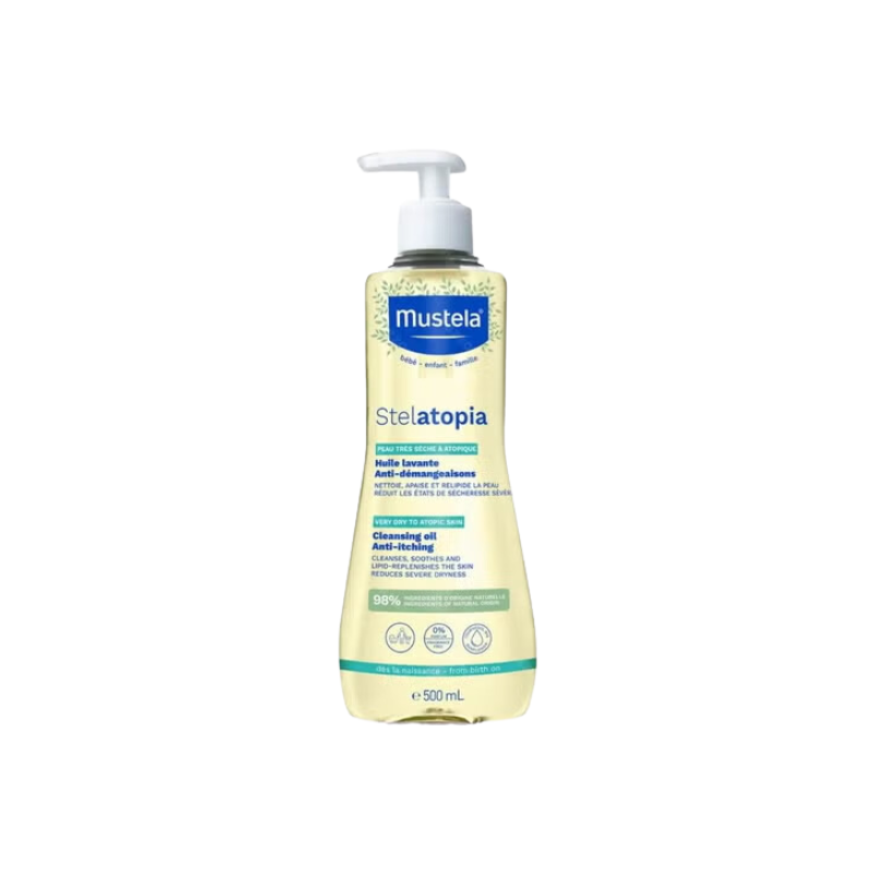 El Aceite Limpiador Anti-Picazón Stelatopia limpia suavemente las pieles muy secas a atópicas, para bebés desde el nacimiento y para toda la familia.