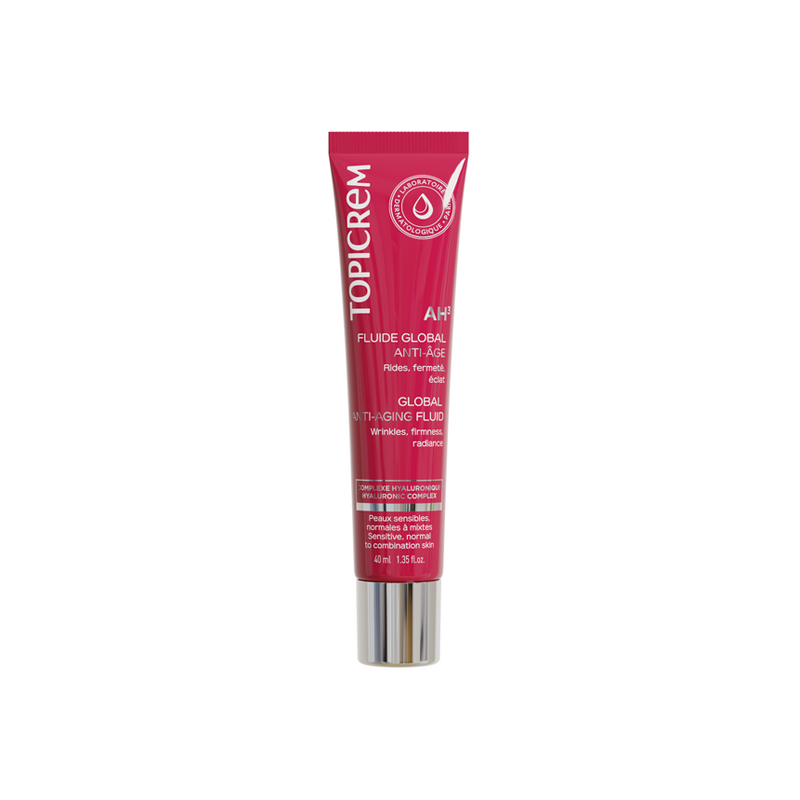 El Fluido Antiedad Global AH3, de textura ligera, corrige las arrugas, redensifica la piel y unifica la tez gracias a un trío de Ácidos Hialurónicos (sales y acetilados), Vitaminas C&E y Vitamina PP estabilizadas, y un dipéptido.