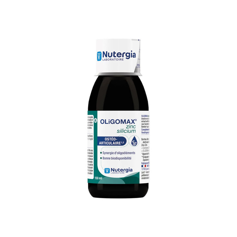 OLiGOMAX zinc - silicio es una combinación de un extracto patentado francés de alga lithothamnion y un concentrado de agua de mar desodorizada, que aporta todos los oligoelementos y está enriquecido con zinc y silicio. El zinc contribuye al metabolismo ácido-base normal y ayuda a mantener una buena estructura ósea. El bambú es bueno para las articulaciones y contiene sílice, que contribuye al bienestar articular.