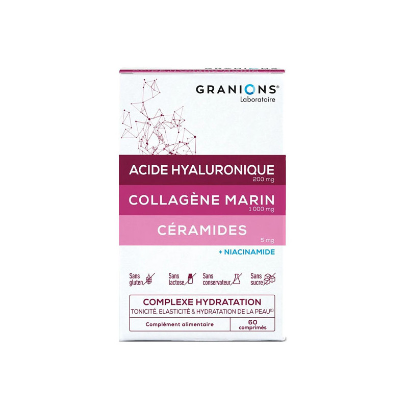 Avec l’âge, les changements hormonaux et l’hygiène de vie, la peau se modifie : les taux de collagène et d’acide hyaluronique diminuent. La densité de la peau change et son hydratation s’affaiblit. Le Laboratoire des Granions a développé une formule unique à base d’actifs incontournables pour la peau :