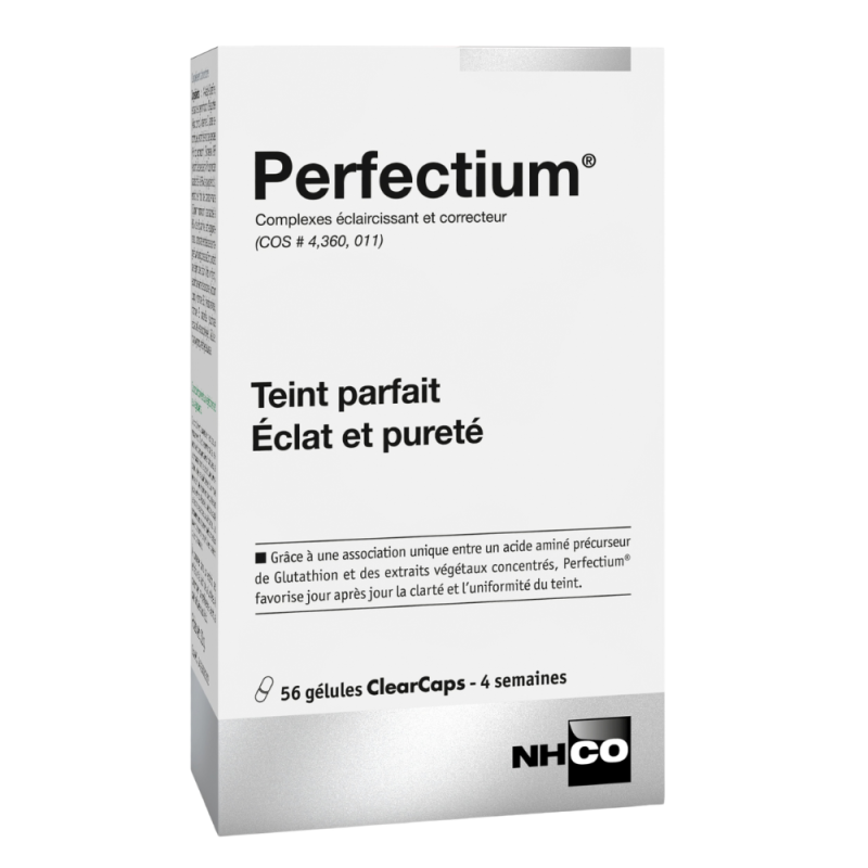 Perfectium Teint Parfait Éclat et Pureté es un complemento alimenticio diseñado para mejorar el aspecto de la piel, en particular el cutis. Formulado con una combinación de ingredientes específicamente seleccionados por sus beneficios para la piel, este producto ayuda a potenciar un cutis radiante y uniforme, al tiempo que contribuye a la pureza de la piel. Los principios activos contenidos en estas cápsulas actúan a varios niveles para ayudar a reducir las imperfecciones, favorecer la producción de colágeno y proteger la piel contra los radicales libres.