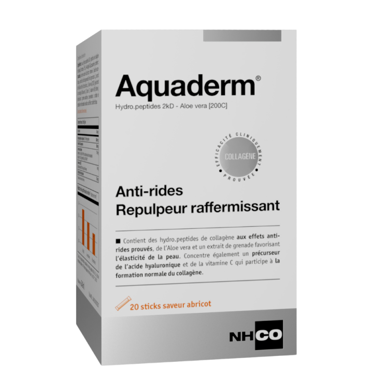 Aquaderm es un complemento alimenticio que favorece la belleza de la piel desde el interior. Contiene un ingrediente activo patentado, Hydro.peptides 2kD, compuesto por polipéptidos de aminoácidos, científicamente probados para reducir la profundidad de las arrugas. También combina extractos de aloe vera y granada, ambos reconocidos por su acción beneficiosa sobre la elasticidad de la piel. Además, aporta N-Acetil-Glucosamina (NAG), un precursor del ácido hialurónico, esencial para mantener la hidratación de la piel.