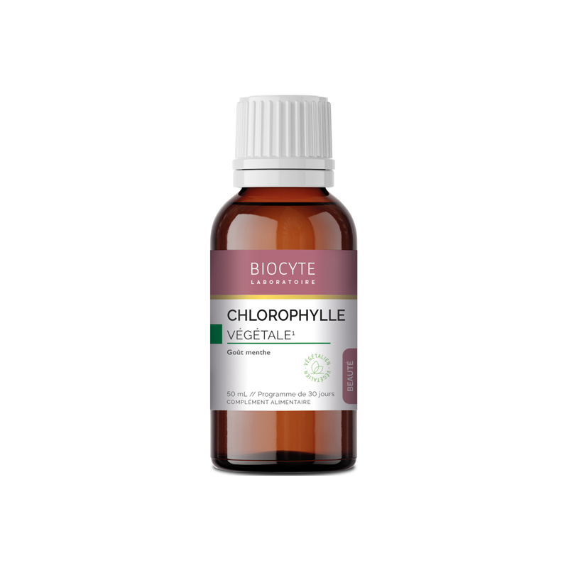 Biocyte Chlorophylle Végétale 50 ml es un complemento alimenticio que contiene vitamina B2, que ayuda a mantener la piel normal, a proteger las células contra el estrés oxidativo y a reducir la fatiga