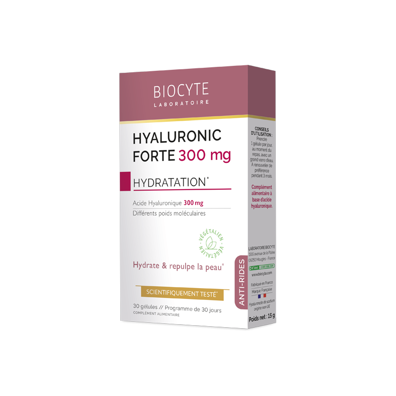 Biocyte HYALURONIC FORTE 300MG es un complemento alimenticio con acción antiarrugas e hidratante de la piel científicamente probada.