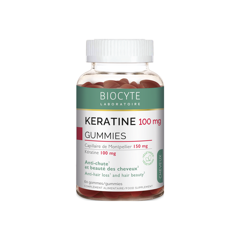 Biocyte KERATINE GUMMIES es un complemento alimenticio en forma de gominolas que favorece el crecimiento y el fortalecimiento del cabello gracias a la cola de caballo. KERATINE GUMMIES actúa sobre la fibra capilar para fortalecerla y favorecer la belleza del cabello gracias al selenio y a la queratina.