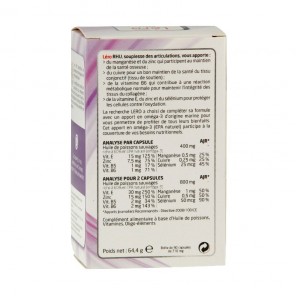 Huile de poissons sauvages dont EPA 350mg, glucosamine HCL 200mg, acétate de DL-alphatocophérol soit vitamine E 15mg, sulfate de Zn monohydrate soit Zn 7.5mg, chlorhydrate de pyridoxine soit vitamine B6 1mg, sulfate de Mn soit Mn 05mg, pantothénate.