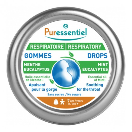 Los chicles Puressentiel Respiratorio Menta Eucalipto contienen aceite esencial de menta con efecto calmante sobre la garganta, la faringe y las cuerdas vocales.