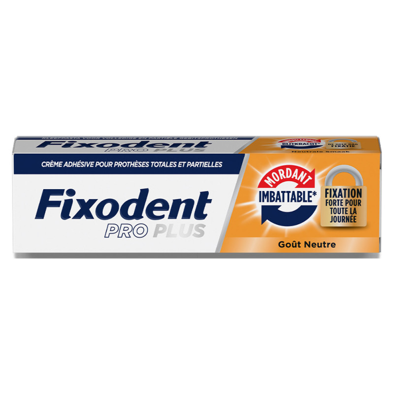 Come con tranquilidad y mantente cómodo todo el día Disfruta de los alimentos más duros con Fixodent Pro Plus Mordant Imbattable. Gracias a su inmejorable fijación, esta crema adhesiva evita que tu dentadura se mueva a lo largo del día, incluso con los alimentos más difíciles de masticar. En la gama Fixodent.