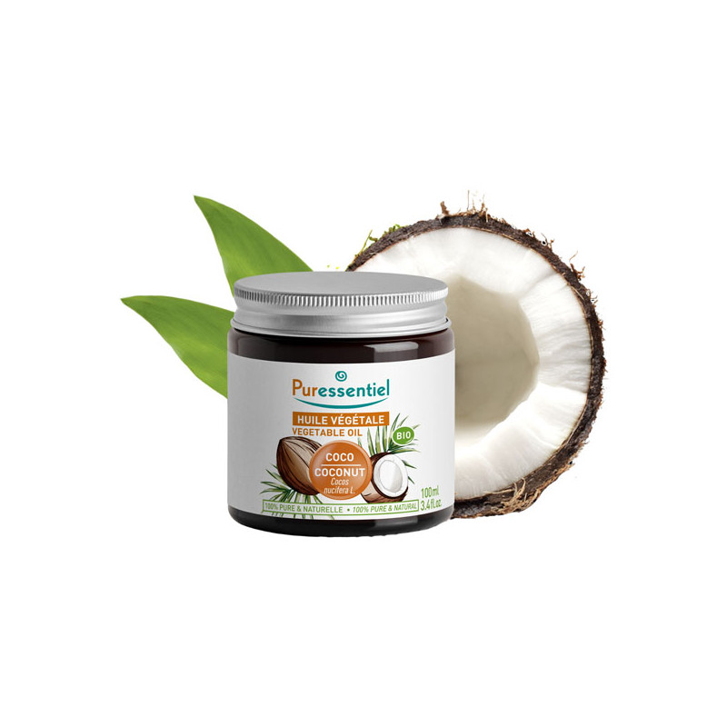 Extraído por presión en frío de la pulpa del coco, el Aceite Vegetal de Coco Ecológico Puressentiel es 100% puro y natural.
