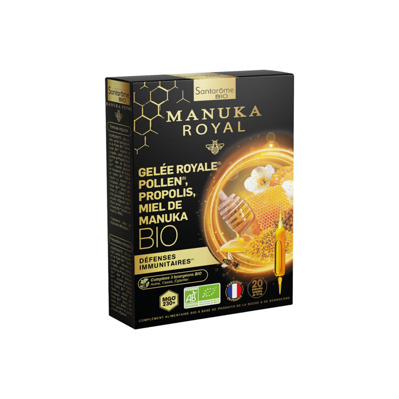 POLEN ORGÁNICO DE MIEL DE MANUKA PROPÓLEO JALEA REAL - 20 ampollas es una fórmula completa, con una alta dosis de 4 productos orgánicos de la colmena cuidadosamente seleccionados y 3 brotes orgánicos.