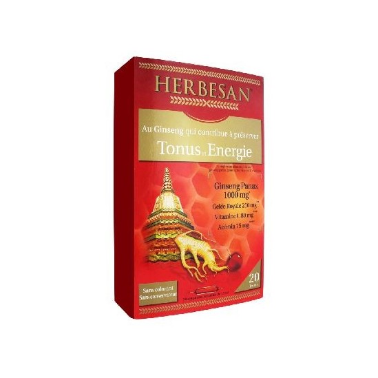 Herbesan Tonus et Energie 20 Ampollas es un complemento alimenticio a base de Panax ginseng, jalea real, Vitamina C y acerola, que ayuda a mantener el tono y la energía durante todo el día. Este complemento alimenticio contiene : - panax Ginseng, raíz reconocida por sus propiedades tonificantes, que ayuda a mantener la vitalidad física e intelectual. - jalea Real, un producto de la colmena conocido por su capacidad para estimular y reforzar el sistema inmunitario. - vitamina C, que ayuda a reducir eficazmente el cansancio. - acerola, una fruta que es fuente de vitamina C. Formulado sin colorantes, conservantes ni alcohol.