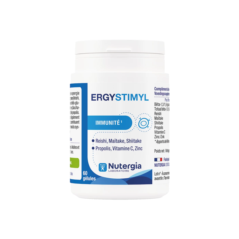 Poudres de Reishi (Ganoderma lucidum (Curtis) P. Karst.), Maïtake (Grifola frondosa (Dicks.) Gray), Shiitake (Lentinula edodes (Berk.) Pegler), antiagglomérants : phosphate dicalcique et stéarate de magnésium végétal; propolis, bêta-glucanes de levure (Saccharomyces cerevisiae), vitamine C (acide L-ascorbique), gluconate de zinc.