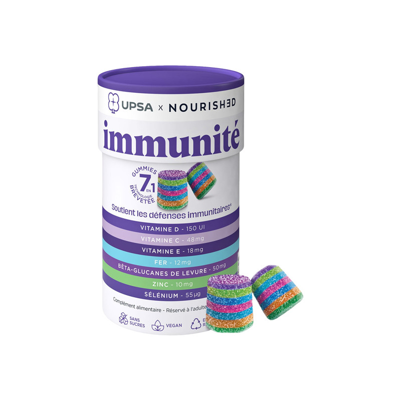 (pour 2 gummies) : Édulcorants : sirop de maltitol, érythritol , gélifiant : pectine , correcteur d'acidité : citrate tripotassique , acidifiants : acide citrique, acide malique , vitamine C 48 mg - 60 % VNR* (acide ascorbique) , bêta-glucanes de levure (Saccharomyces cerevisiae) 50 mg , fer 12 mg - 85 % VNR* (citrate ferreux) , zinc 10 mg - 100 % VNR* (citrate de zinc) , vitamine D3 150 UI** (3,75 µg) - 75 % VNR* (cholécalciférol) , sélénium 55 µg - 100 % VNR* (levure enrichie en sélénium (sulfites)) , vitamine E 18 mg - 150 % VNR* (acétate de DL-alpha tocophéryle) , concentré de carotte , concentré de betterave , concentré de spiruline , colorant : curcumine , arôme , arômes naturels