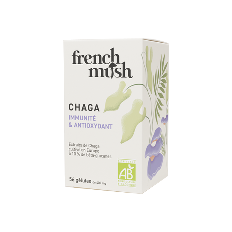 - Chaque gélule renferme 400 mg d'extraits de fruiting body de Chaga, également originaires de Finlande. De cette quantité, 10% (équivalent à 40 mg) sont constitués de bêta-glucanes.