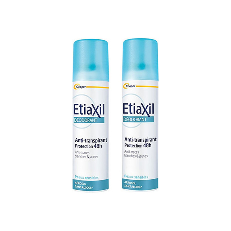 ETIAXIL El desodorante en aerosol tiene una acción desodorante y antitranspirante durante 48 horas. Previene la aparición de manchas amarillas y blancas en los tejidos y respeta las pieles sensibles.