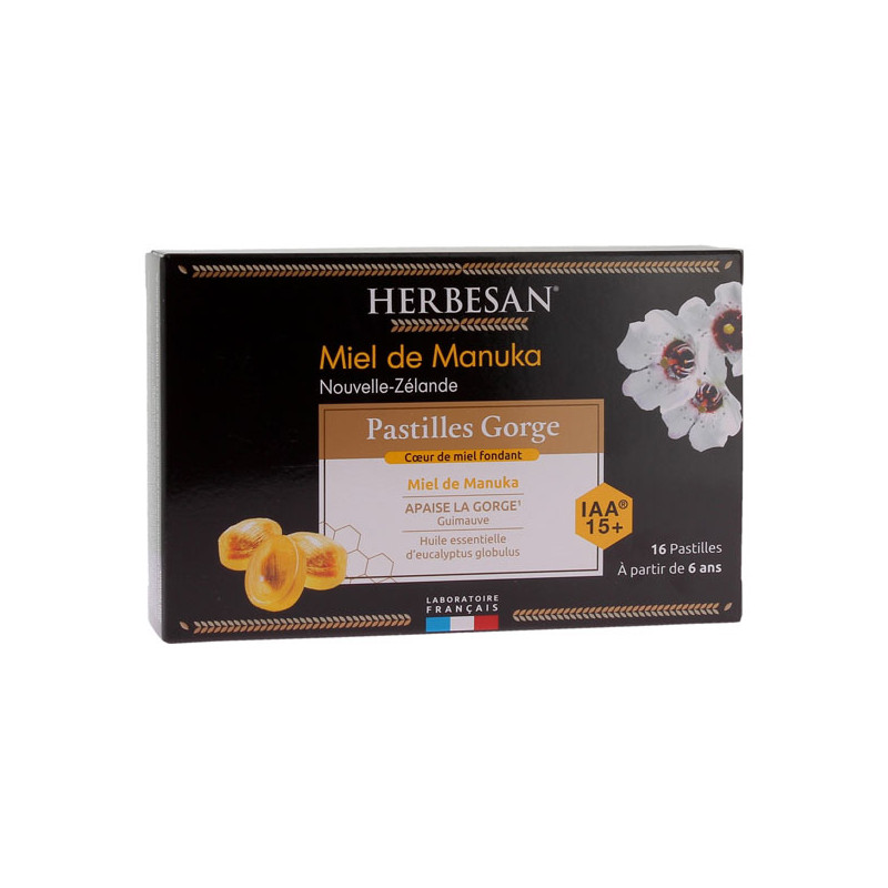 Sucre, Sirop de Glucose, Miel de Manuka Iaa15+, Extrait Sec de Racines de Guimauve (Althaea Officinalis), Huile Essentielle Chémotypée d’eucalyptus Globulus.