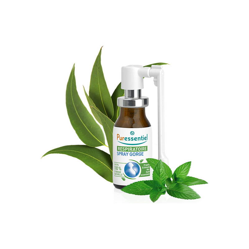 Puressentiel Spray Respiratorio Garganta contiene aceite esencial de menta piperita, que tiene un efecto calmante sobre la garganta, la faringe y las cuerdas vocales, y aceite esencial de tomillo, que contribuye al funcionamiento óptimo del sistema respiratorio.
