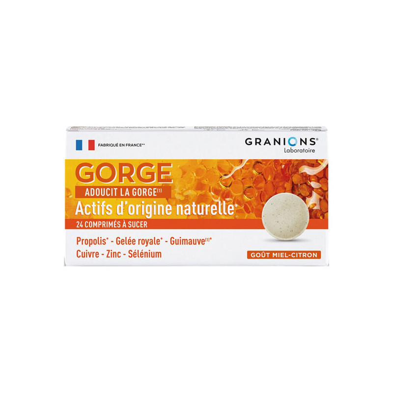 Este comprimido masticable contiene própolis, jalea real, malvavisco, zinc, cobre y selenio para aliviar la garganta.