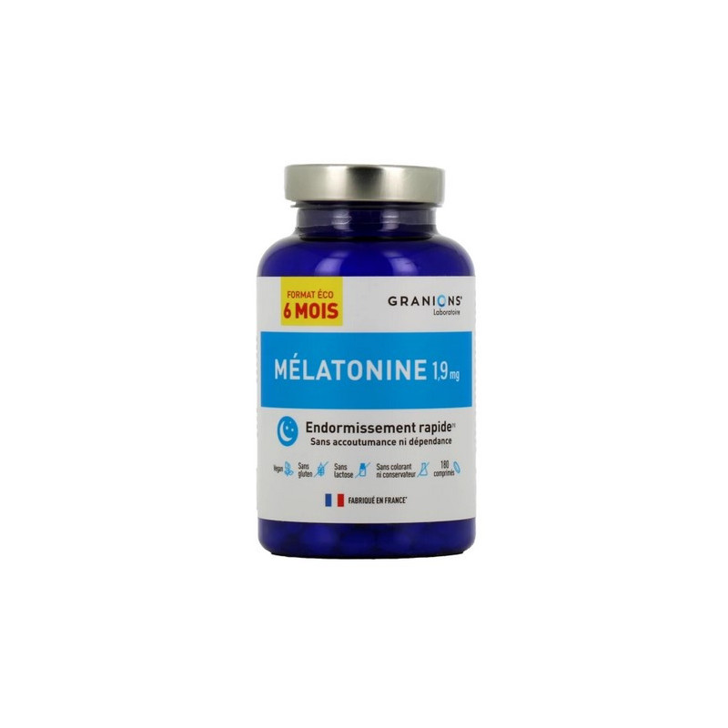 El complemento alimenticio Mélatonine 1,9 mg Endormissement rapide de Granions está fabricado en Francia. Se presenta en forma de comprimidos (frasco de 180 comprimidos, equivalente a una toma de 6 meses) o de gominolas (chicles) con un agradable sabor a grosella negra, y cuya composición no contiene azúcar, aromas artificiales ni gelatina animal.