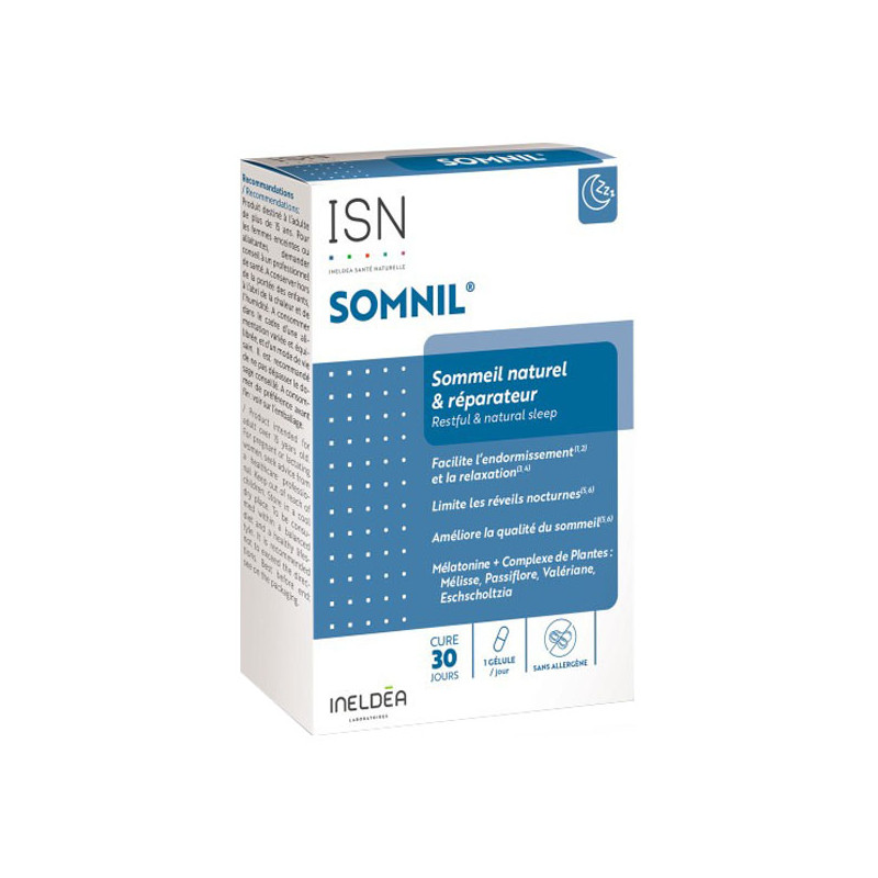 Triptófano y Vitamina B6, con acciones sobre todas las fases del sueño para un sueño natural y reparador, SOMNIL facilita la relajación y la conciliación del sueño, limita los despertares nocturnos y mejora la calidad del sueño.
