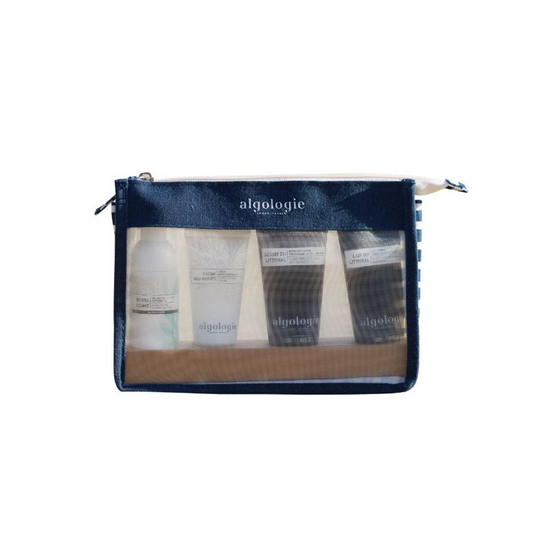 En un bonito estuche de color marino, llévate contigo los 4 esenciales Algologie: Espuma Limpiadora Oxigenante, Crema Olas, Exfoliante Litoral y Leche Litoral para un verano perfectamente hidratado.