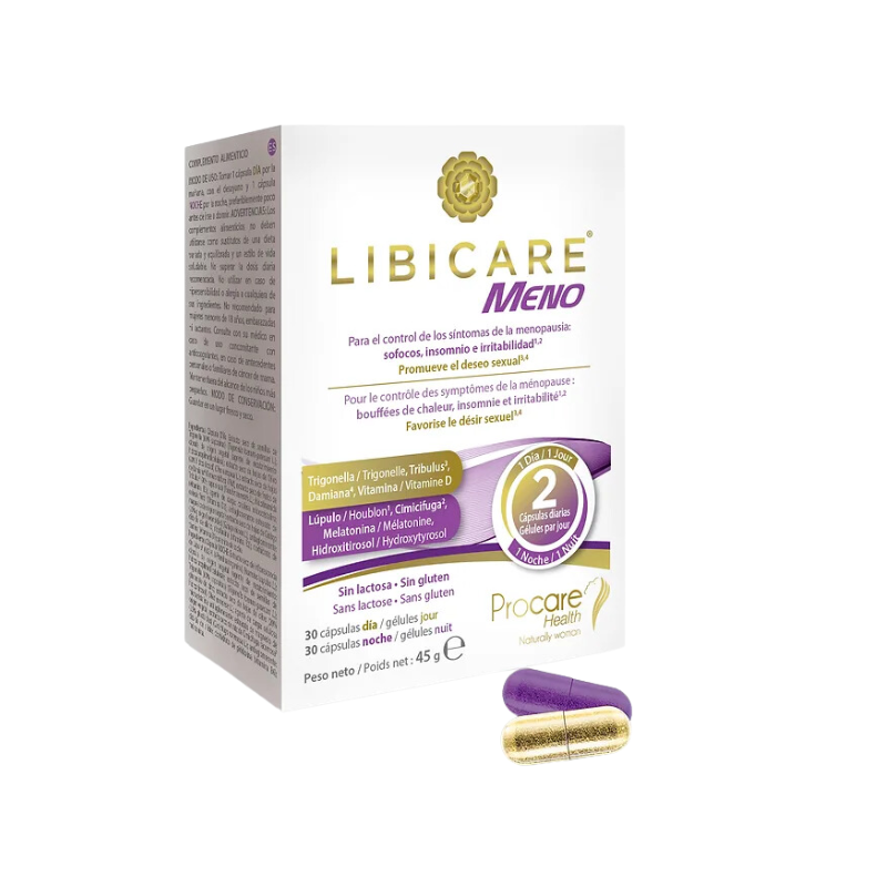 Libicare Meno es un complemento alimenticio no hormonal formulado para aliviar los síntomas de la menopausia.