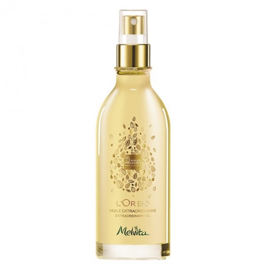 L'or bio extraordinario aceite seco embellecedor. L'or bio de melvita es un aceite seco 100% natural de textura ligera y fluida, delicadamente perfumado y de rápida absorción sin dejar película grasa. Su fórmula combina 5 aceites raros y preciosos procedentes de las cuatro esquinas del mundo, seleccionados por su riqueza en omega 3, 6 y 9: - aceite de argán de Marruecos, con propiedades cosméticas excepcionales - aceite de kendi de la Amazonia, con propiedades regeneradoras - aceite de buriti de Brasil, que nutre y favorece un brillo saludable - aceite de pracaxi de la Amazonia, que mejora el brillo y la resistencia del cabello