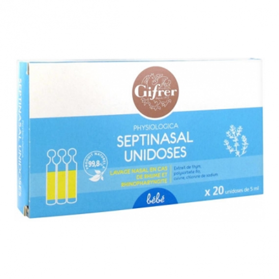 Septinasal unidosis es una solución de lavado nasal para resfriados y rinofaringitis que contiene solución salina fisiológica combinada con glicerol, tomillo (conocido por sus propiedades antibacterianas) y cobre, destinada a lactantes, niños y adultos.