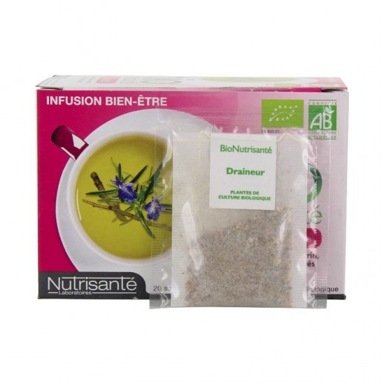 La infusión Nutrisanté Drenante Orgánico favorece la eliminación de toxinas y agua almacenada principalmente en muslos y glúteos.