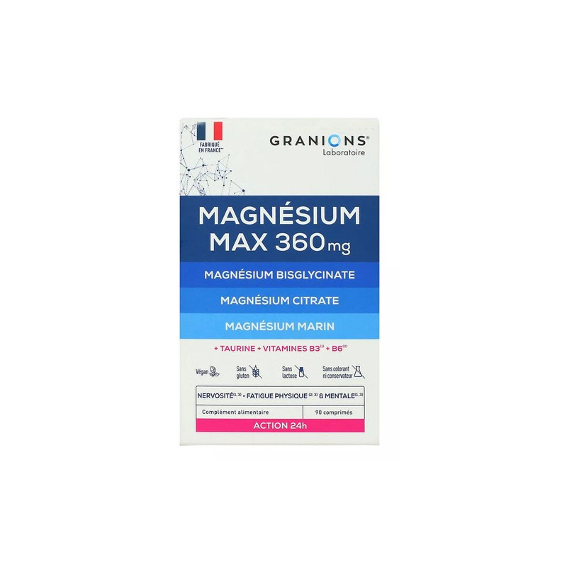 Magnesio Max 360 mg es un complemento alimenticio del laboratorio Granions en forma de comprimidos, para el nerviosismo y la fatiga física y mental.
