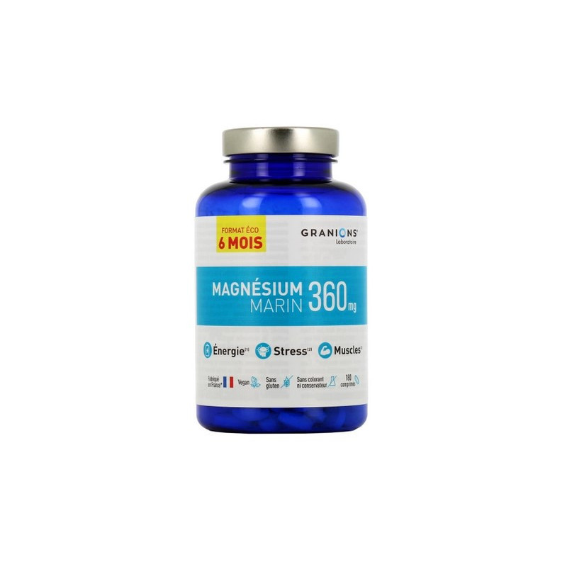 1 solo comprimido de Magnesio Marino 360 mg de Granions le aporta 360 mg de magnesio marino. El magnesio marino ayuda a reducir la fatiga y el estrés, y contribuye al buen funcionamiento de los músculos.