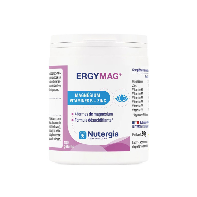 El magnesio y las vitaminas B3 y B6 contribuyen al mantenimiento del sistema nervioso y de las funciones psicológicas implicadas en la gestión del estrés. ERGYMAG también es rico en zinc, que contribuye a un metabolismo ácido-base normal, a desacidificar el organismo.