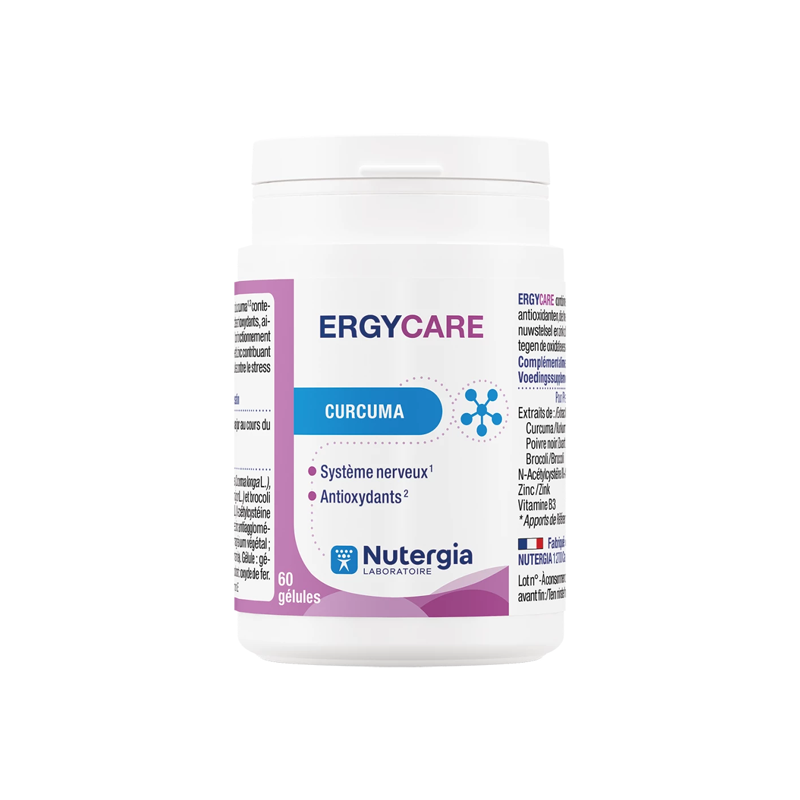 ERGYCARE contiene cúrcuma, que tiene propiedades antioxidantes y contribuye al buen equilibrio nervioso. La vitamina B3 contribuye al funcionamiento normal del sistema nervioso.