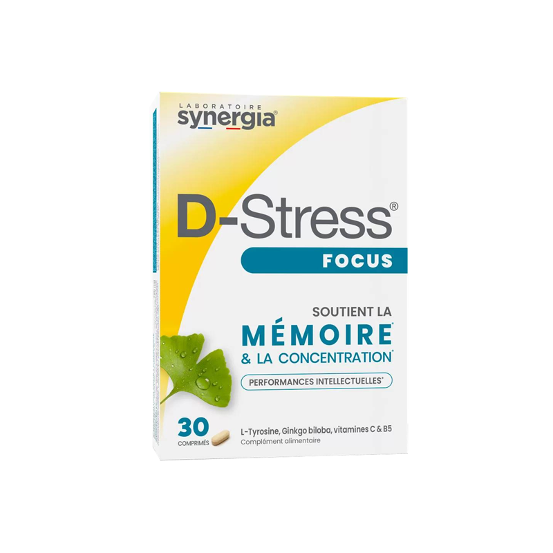 ¡D-Stress FOCUS es su aliado para la memoria y la concentración! Este complemento alimenticio ayuda a mejorar el rendimiento intelectual y las funciones cognitivas gracias a una combinación de L-Tirosina, Ginkgo biloba y vitamina C. ¡Tómelo el día D!