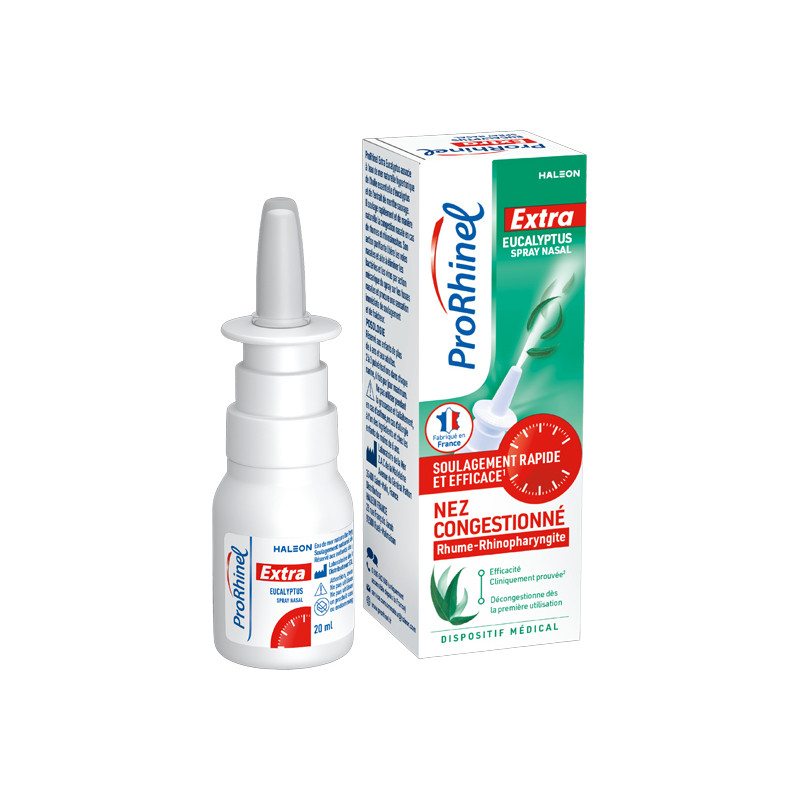 El spray nasal ProRhinel Extra Eucalipto combina agua de mar natural hipertónica con aceite esencial de eucalipto y extracto de menta silvestre (excipiente) para proporcionar un alivio rápido y natural de la congestión nasal en caso de resfriado y rinosinusitis. Su acción purificante despeja las fosas nasales y ayuda a eliminar bacterias y virus mediante la acción mecánica del spray sobre la cavidad nasal, al tiempo que le proporciona una oleada de frescor. ¡Una sensación de alivio inmediata!