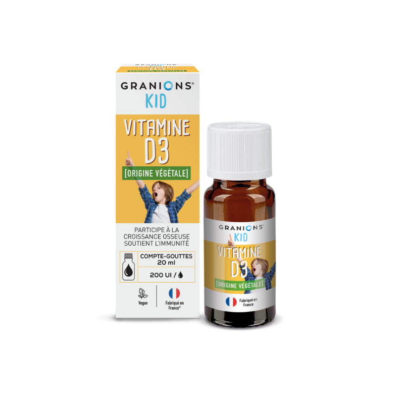 Granions kid vitamina D3 es un complemento alimenticio que contiene vitamina D3 de origen vegetal derivada del liquen, una combinación de hongos y algas que crece en rocas y árboles.
