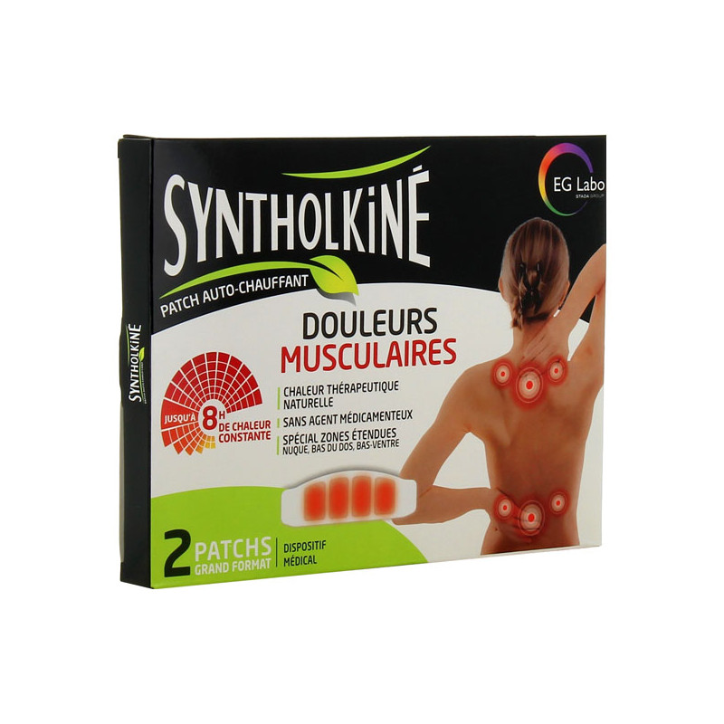 El parche autocalentable de gran formato SyntholKiné utiliza el principio de la termoterapia (tratamiento térmico) para aliviar los dolores musculares de la nuca, la zona lumbar y el bajo vientre.