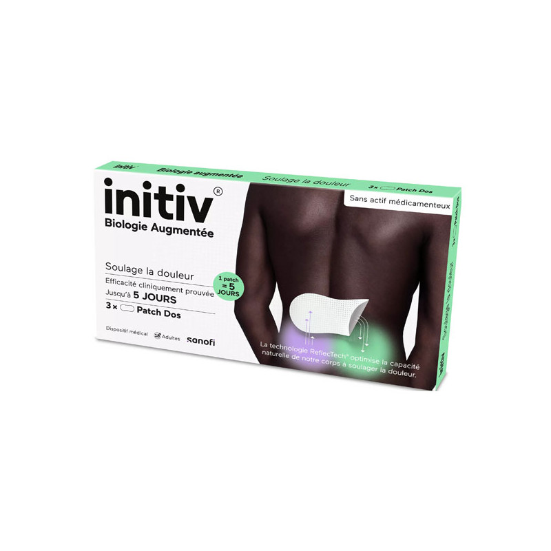 initiv est un patch pour le dos sans actif médicamenteux, ultrafin, résistant à l'eau et sans odeur, conçu contre les douleurs musculo-squelettiques (touchant les articulations, les muscles et les tendons) au niveau du dos de l'adulte.