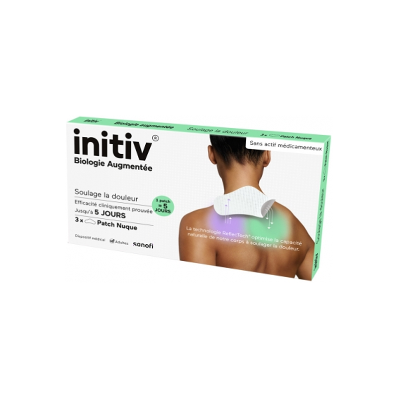 Initiv est un patch pour la nuque sans actif médicamenteux, ultrafin, résistant à l'eau et sans odeur, conçu pour soulager les douleurs musculo-squelettiques (touchant les articulations, les muscles et les tendons) au niveau de la nuque.