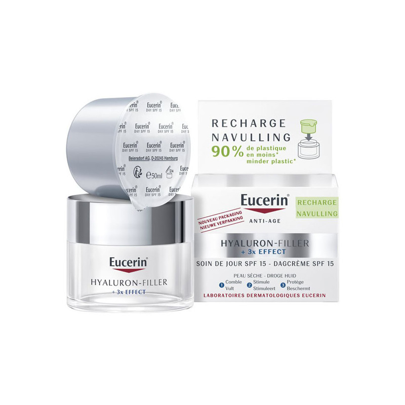 Este recambio de HYALURON-FILLER + 3x EFFECT Crema de Día SPF 15 es compatible con todos los tarros de cuidado facial y contiene un 90% menos de plástico que el tarro clásico de HYALURON-FILLER.