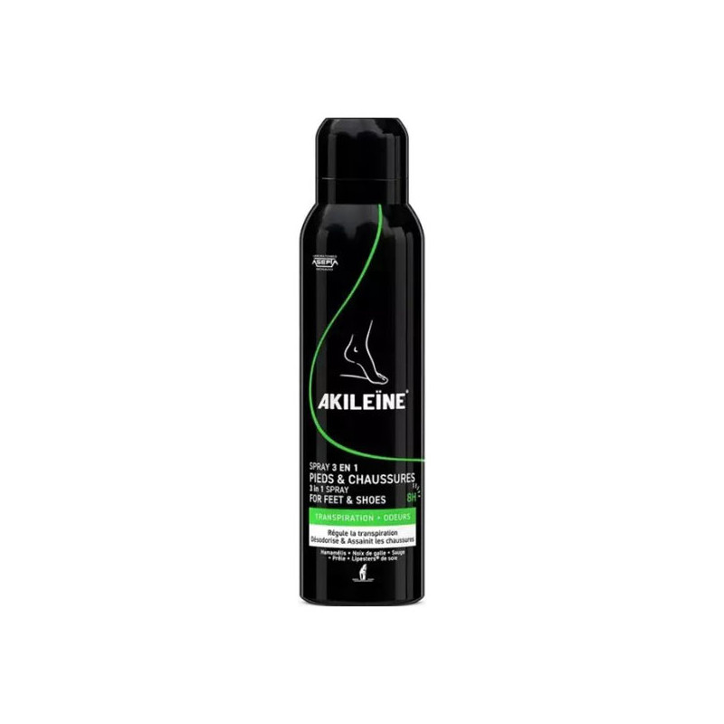 AKILEÏNE 3 en 1 Spray para pies y calzado regula la transpiración excesiva, desodoriza y purifica el interior del calzado.
