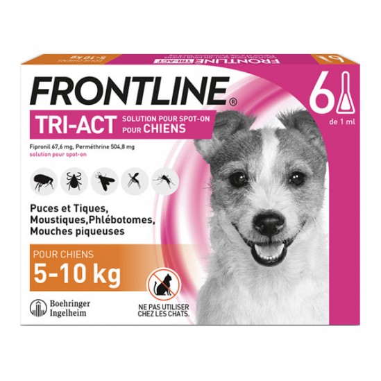FRONTLINE TRI-ACT es un medicamento veterinario indicado para el control de pulgas, garrapatas, mosquitos, flebótomos y moscas picadoras y reduce el riesgo de infección por Leishmania infantum en perros. Todos los medicamentos pueden entrañar riesgos, por lo que debe pedir consejo a su farmacéutico o veterinario. Lea atentamente el prospecto. Si los síntomas persisten, consulte a un veterinario. No utilizar en conejos. FRONTLINE No utilizar TRI-ACT en gatos. Lávese las manos después de la administración.