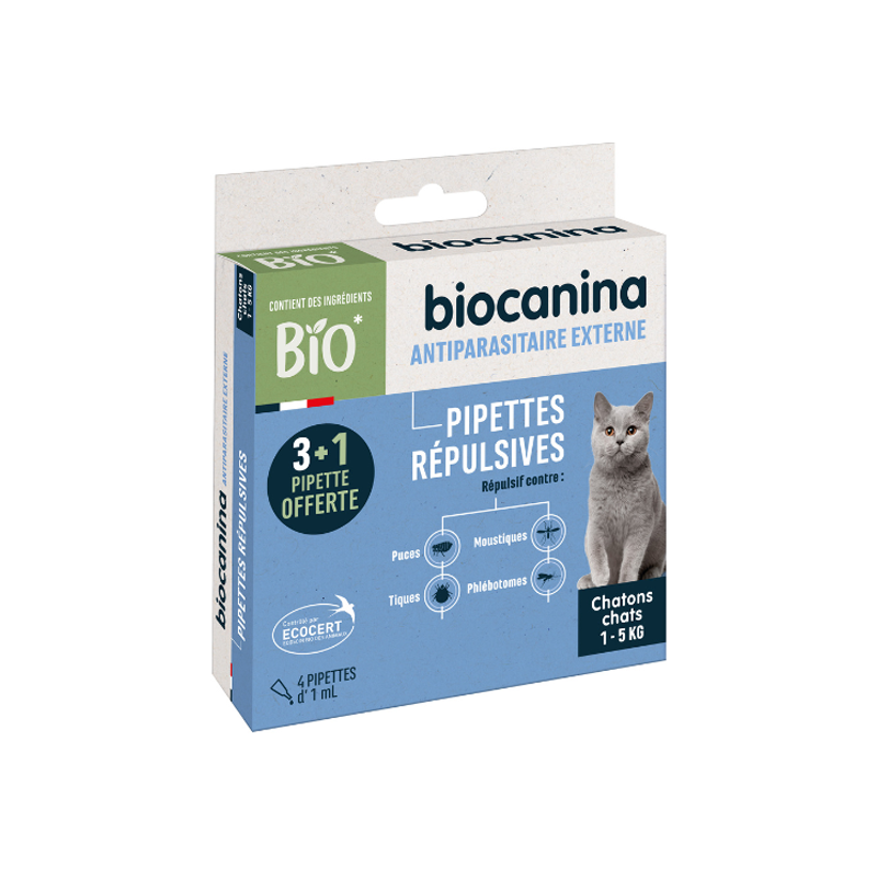 Protege a los gatitos (a partir de las 8 semanas de edad) y a los gatos de los parásitos externos durante un mes, gracias a la acción repelente de los principios activos ecológicos certificados.