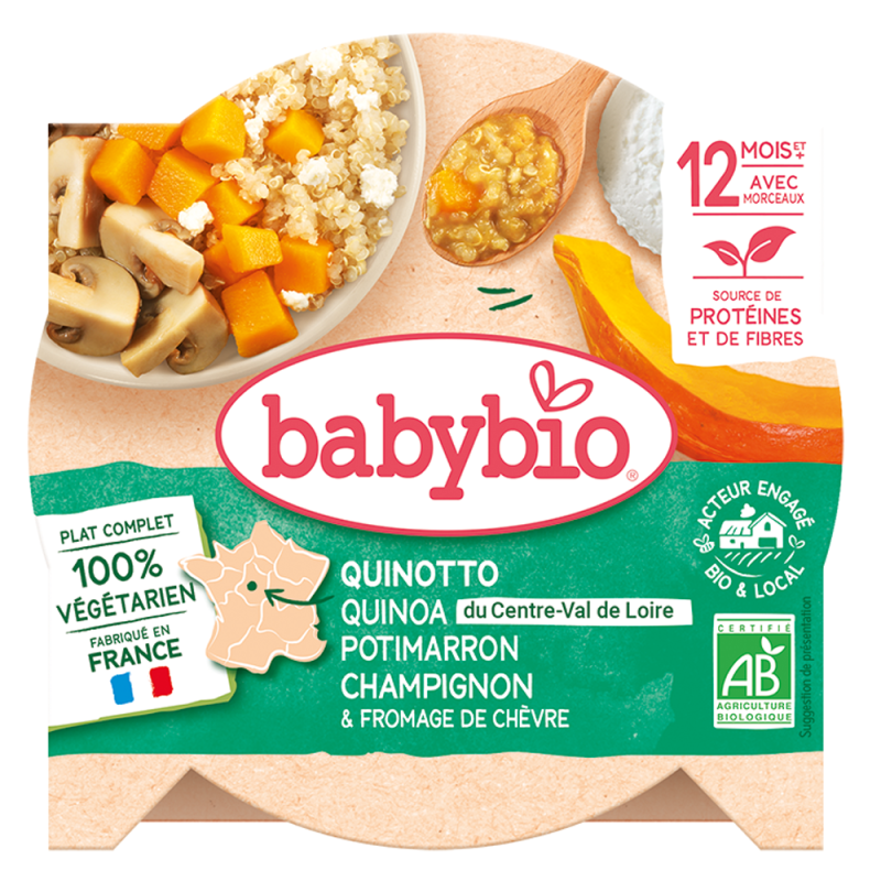 Descubra la calabaza con quinoa del Centre-Val de Loire, los boniatos y las patatas de nuestras granjas de Pays de la Loire, las setas y el queso de cabra de nuestras regiones. Además de ser una fuente de proteínas y fibra, ¡esta original receta hará las delicias del bebé con todos sus bocados!