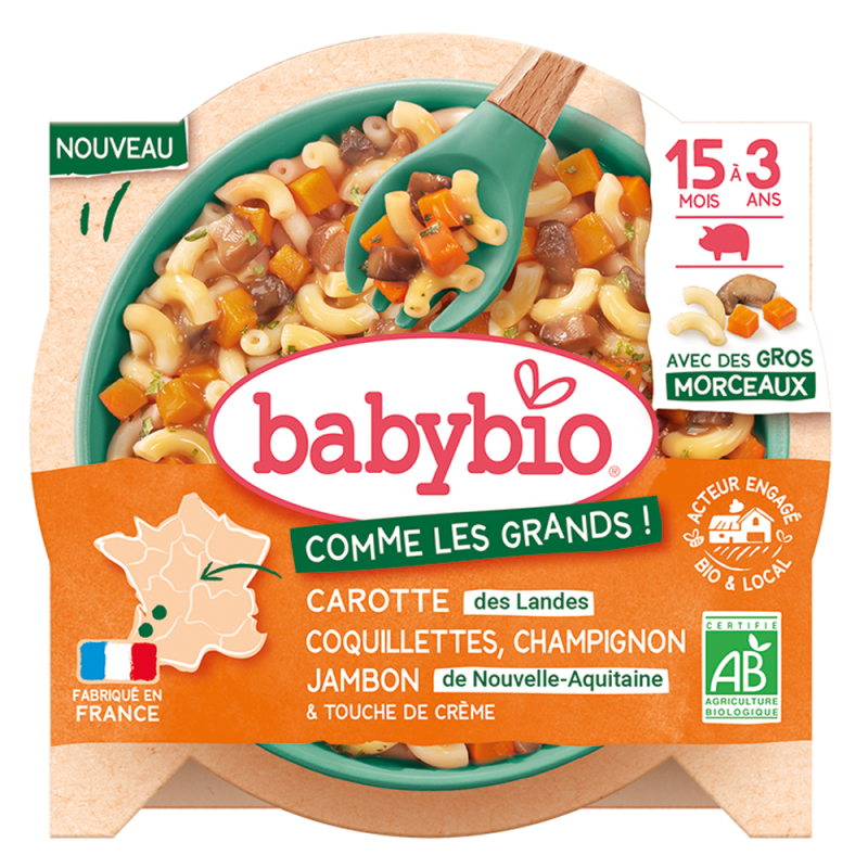 El bebé está creciendo y quiere hacer todo lo que hacen los mayores... ¡incluso comer solo! Con este plato, el bebé se maravillará con la forma y el color de las coquillettes que se derriten, las zanahorias cortadas en dados y los trocitos de champiñón, mientras explora cada textura con los ojos, la boca e incluso las manos.