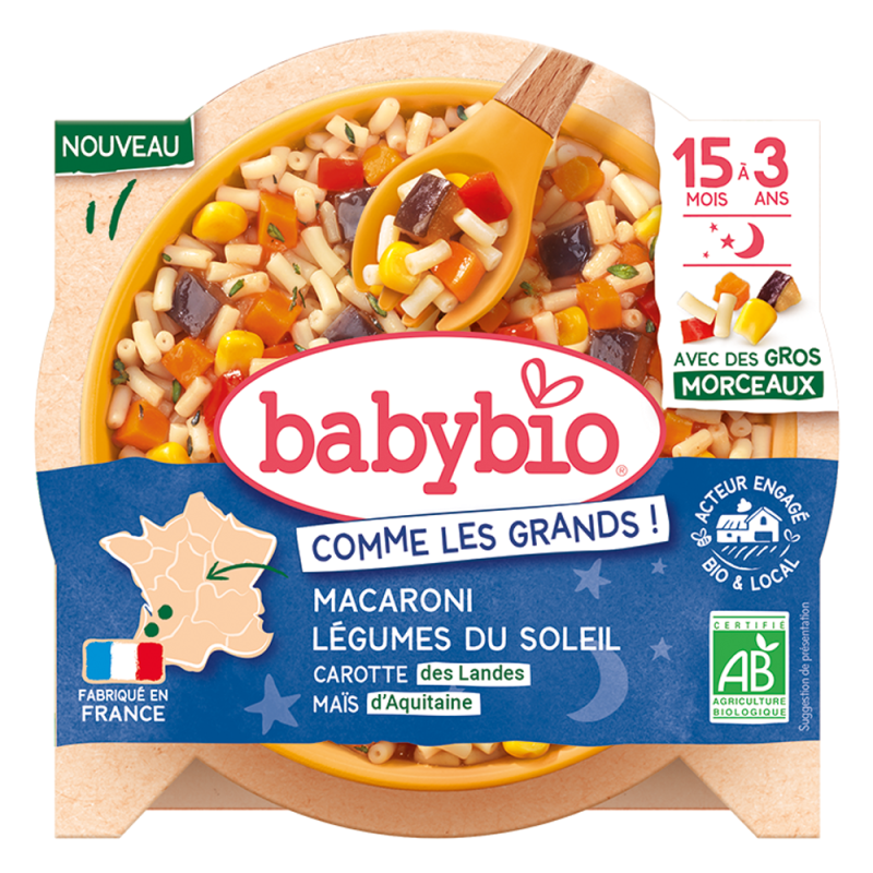 El bebé crece y quiere hacer todo lo que hacen los mayores... ¡incluso comer solo! Con este plato, el bebé se maravillará con la forma y el color de los trozos de berenjena, zanahoria, pimiento, maíz y macarrones fundentes, mientras explora cada textura con los ojos, la boca e incluso las manos.