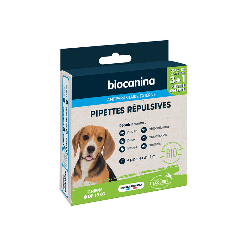 Protege a los cachorros y perros (de 250 g a 15 kg) de los parásitos externos durante un mes, gracias a la acción repelente de los principios activos ecológicos certificados.