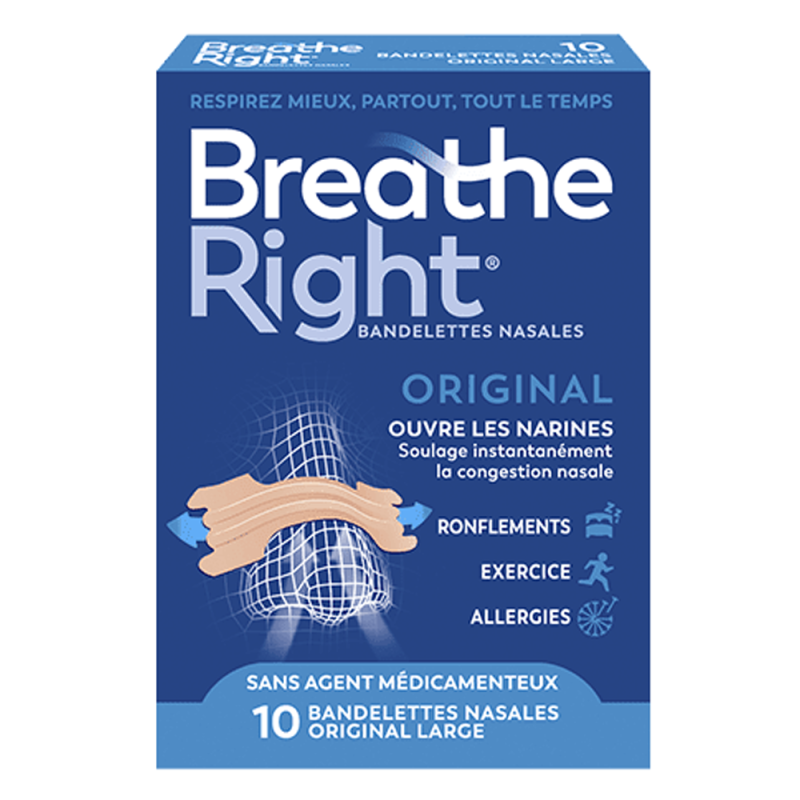 Las tiras nasales Breathe Right son tiras flexibles con resorte que abren suavemente las fosas nasales para ayudar a que el aire fluya por la nariz, de modo que pueda respirar mejor. Breathe Right alivia la congestión nasal que puede estar causada por resfriados, alergias y un tabique desviado. Las tiras nasales Breathe Right pueden utilizarse para ayudarle a tomar más aire y respirar mejor si padece ronquidos o alergias debidas a la congestión nasal, pero también cuando hace ejercicio o simplemente se relaja.