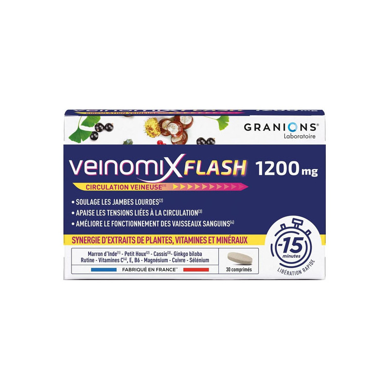 VEINOMIX FLASH 1200 mg es una combinación única de 11 plantas, vitaminas y minerales rigurosamente seleccionados para favorecer la circulación venosa gracias a sus 6 acciones específicas.