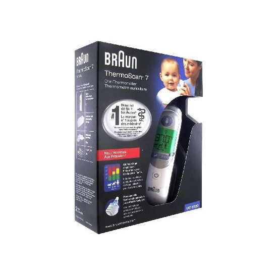 Braun Thermoscan 7 IRT 6520 es un termómetro para bebés, niños y también adultos, con un indicador de fiebre ajustable a la edad. Este termómetro cuenta con una tecnología profesional que garantiza temperaturas siempre precisas y registra las 9 últimas temperaturas tomadas. Dispone de una pantalla codificada por colores Age Precision, que permite ajustar la edad de la persona para que la toma de temperatura según la edad sea más precisa. La pantalla codificada por colores cambia automáticamente de color según la temperatura registrada. A diferencia de otros termómetros de oído, el Braun Thermoscan 7 IRT 6520 dispone de una punta precalentada para evitar que la temperatura se enfríe. Su sistema de posicionamiento se ilumina para una mayor precisión, y una señal sonora le indica que el dispositivo está correctamente colocado para una medición óptima de la temperatura. Contenido de la caja: - Braun Thermoscan 7 IRT 6520 - 1 estuche protector con almacenamiento de puntas - 21 puntas desechables - 2 pilas AA LR6 de 1,5 V